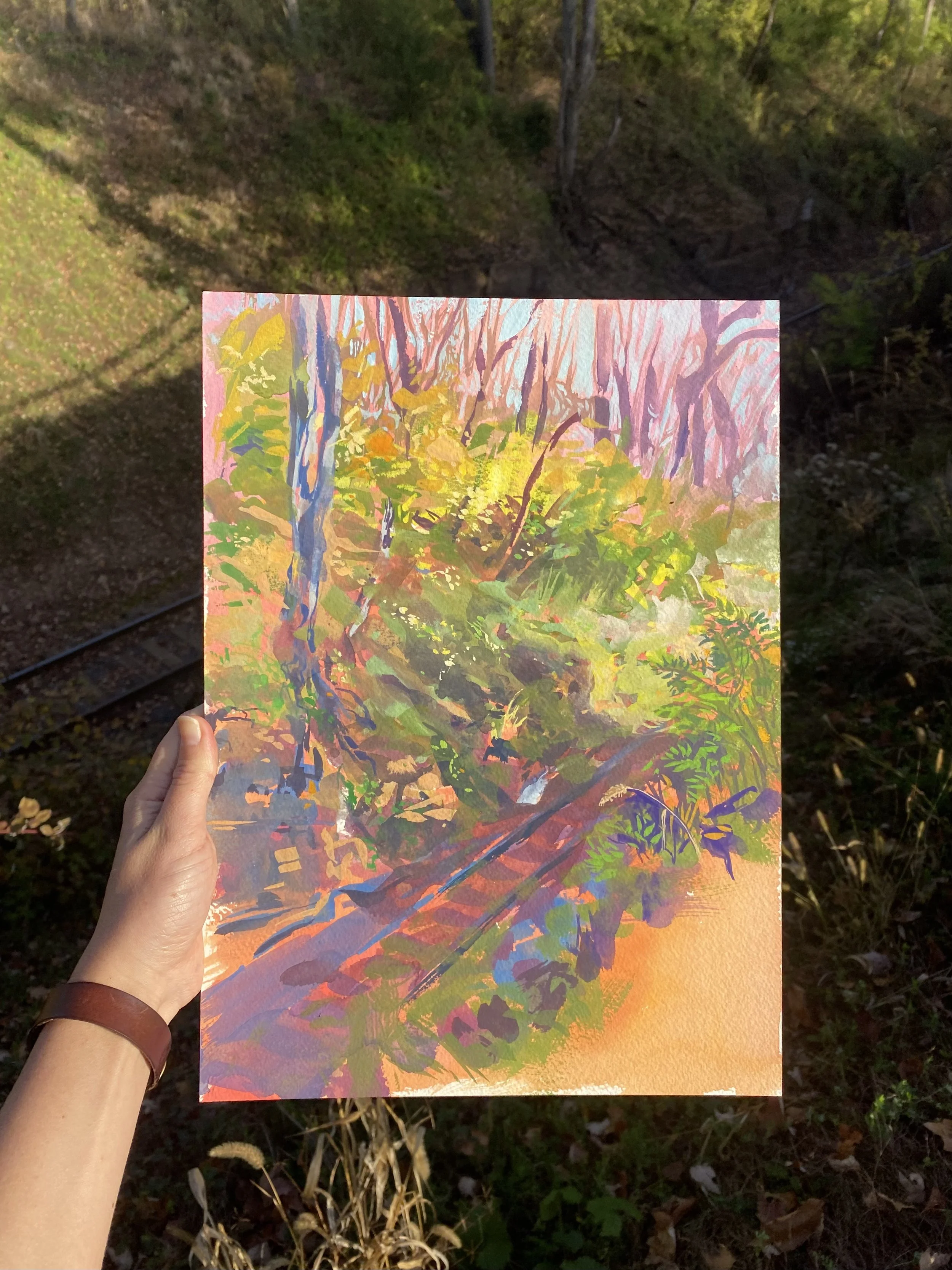 Plein aire gouache study by abandoned railroad tracks.