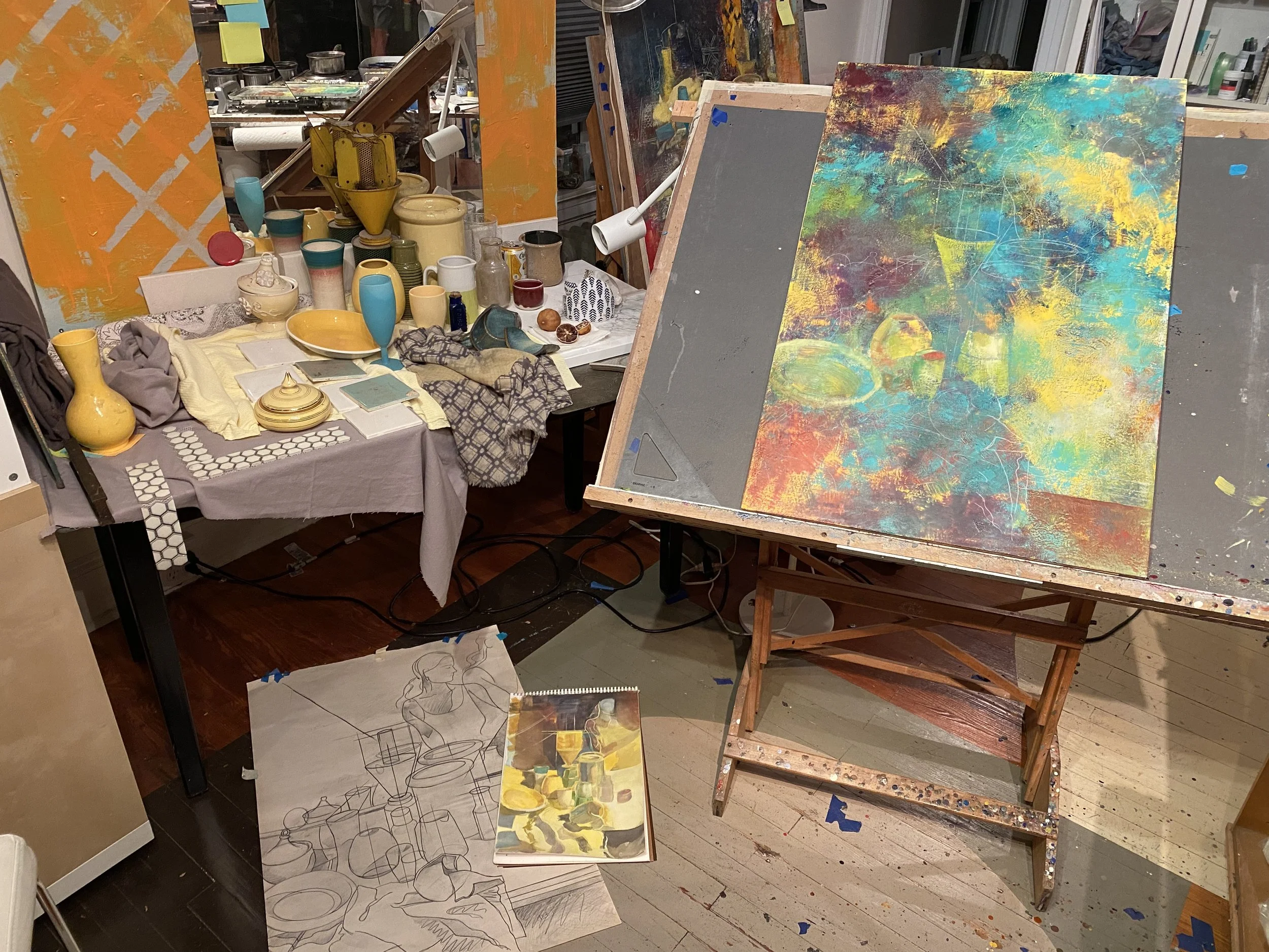 Still life next to pencil and gouache studies for encaustic painting.