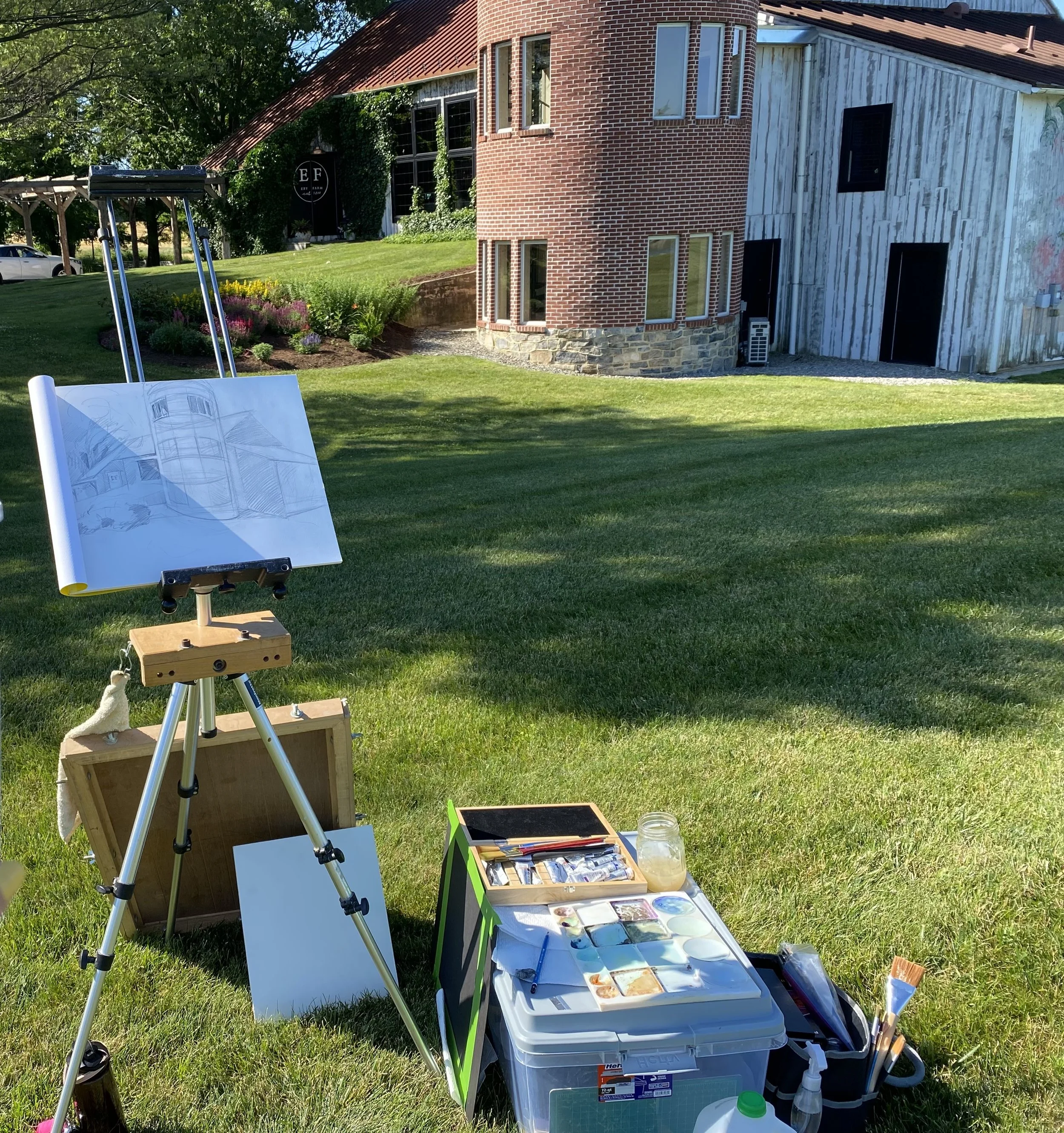 Graphite on bristol architectural study for 3x4’ casein commission Evening at Eby Farm.