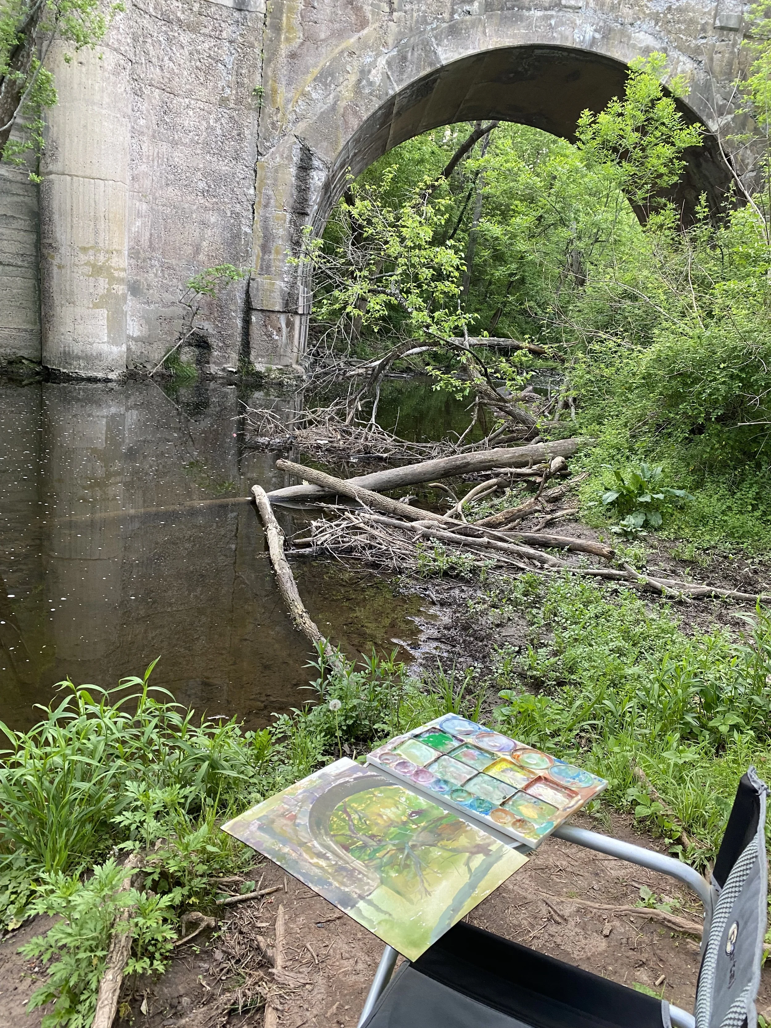 Plein aire gouache, foundation for Farm Park Bridge.